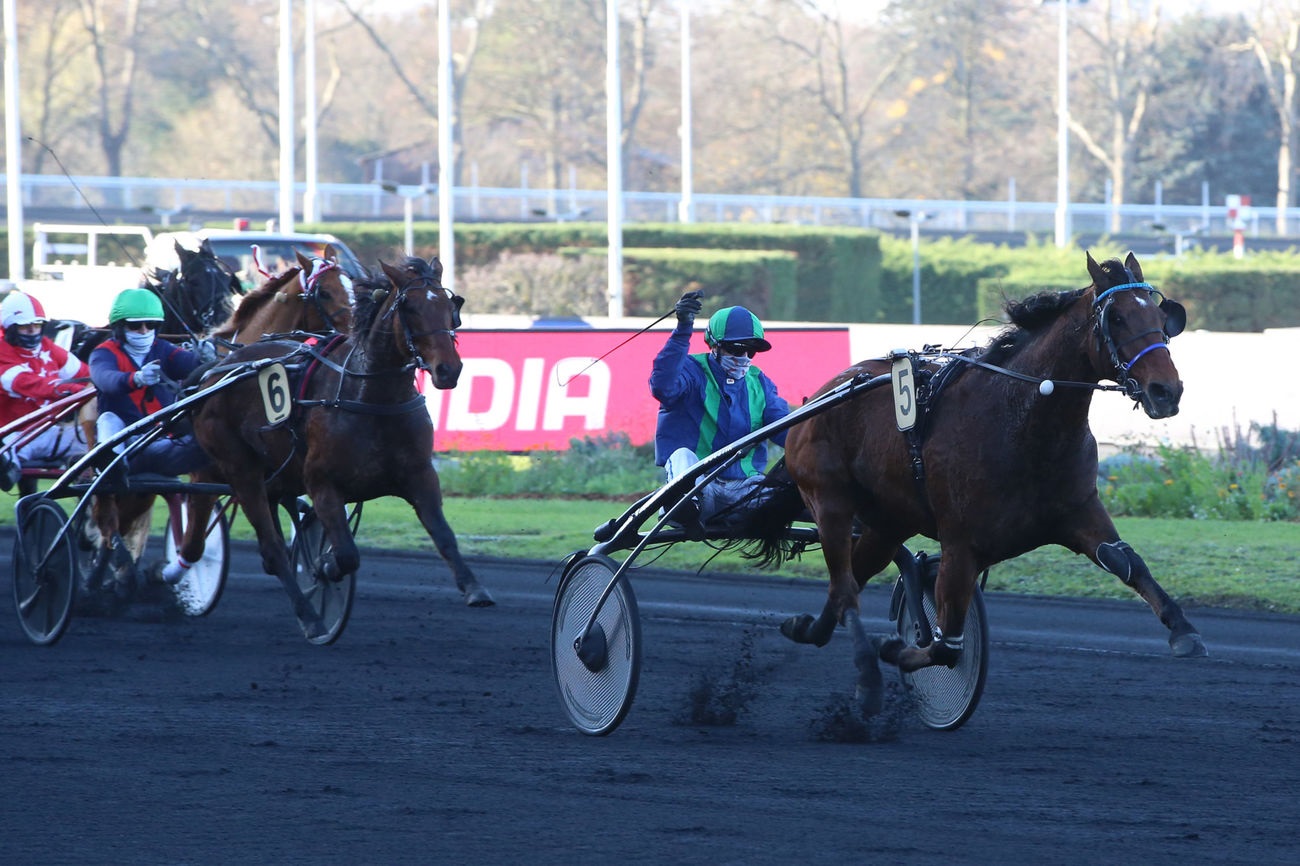 Eawy d'Eole en coup de vent ![]() Si pour beaucoup cet exercice 2020 s'avère être un calvaire, l'entraîneur-driver Antoine Lhérété est pour sa part en train de boucler sa meilleure année après cinq saisons d'installation. Il est plus aisé de lutter contre les vents contraires quand on possède Eawy d'Eole dans son écurie. Déferré pour la première fois des antérieurs dans le Prix de Castelnaudary, ce fils de Kitcho d'Ecajeul a d'abord assisté à l'évasion de Espoir Wic et de Ellora du Cèdre dans l'ultime courbe avant de les déposséder du titre dans un dernier effort à cinquante mètres du poteau. Voilà plusieurs années qu'Antoine Lhérété n'avait plus gagné en tant que driver à Vincennes, mais il se souviendra bien longtemps de ce dévastateur coup de rein qui lui offrait, ce vendredi, son premier Quinté. David Thomain qui avait suivi Jean-Michel Bazire (l'un des ex-patrons du lauréat, ndlr) dans sa progression devrait se résoudre au second accessit. Echo de Chanlecy, qui n'a pas eu les coudées franches au moment de l'emballage final, concluait fort reléguant Dexter des Baux à la cinquième place d'une joute où aucun des cinq premiers à mi-montée ne fera l'arrivée. Dans cette épreuve taillée sur mesure pour les attentistes, Eawy d'Eole aura survolé les derniers cinq cents mètres. Ses adversaires n'ont pas senti le vent tourner...