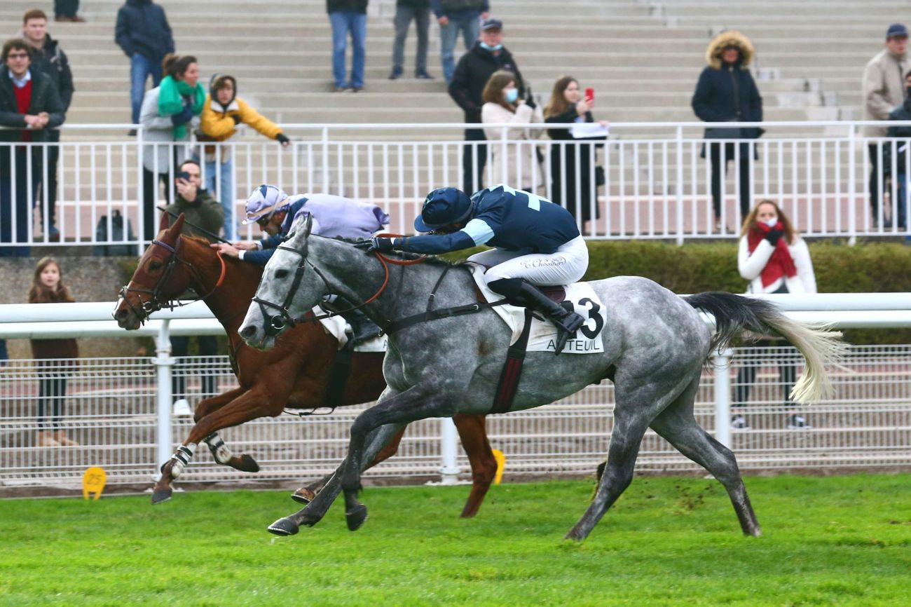 Galopin de Balme en bon gamin d'Auteuil ![]() Restant, après un an d’absence, sur deux chutes sur les gros obstacles, Galopin de Balme revenait sur les balais, samedi à Auteuil, après les avoir délaissés durant vingt mois. Tout vient à point à qui sait attendre. Et s’il est un professionnel qui a de la patience, c’est absolument François Nicolle. Certes souvent plus délaissé dans les handicaps que dans les joutes classiques, mais l’on ne remporte pas soixante-et-une courses en une année à Auteuil en ne courant que les Groupes, l’entraîneur de Charente-Maritime est constamment dans le bon timing. Parti à 15/1, ce beau gris monté par Théo Chevillard s’est gentiment rapproché en face pour conjointement sauter l’avant dernière difficulté avec Bonaparte Sizing, puis a prolongé son effort sur le plat pour contenir le retour d’un King of Run qui aurait lui aussi, sur sa régularité, mérité sa première couronne dans un Quinté. Deuxième de ce Prix François-de-Ganay en 2019, récidiviste en 2020, Bonaparte Sizing perd une nouvelle bataille tout en restant sur la ligne de front, mais récolte un nouvel accessit devant Grand de Thaix et l’inattendue Peggy dont la performance à ce niveau est tout sauf « cochonne ».